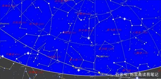 这一大段话中,“驷见而陨霜”一句指的就是当凌晨看到房星时,就到了陨霜的时节。这个时节是什么时候呢?从这段话可以推知:凌晨时看到苍龙氐宿(天根)时“水涸”,这个时间是十月(“十月成梁”、“水涸则成梁”)。氐宿就在房宿近旁,“驷见”的时间又要晚于氐宿的晨现,因此完全可以认定“直方”的时间也在孟冬十月,斗建亥之时。观下图天象可见,孟冬十月的凌晨,东宫青龙的氐宿正在东南方,而下方的房宿则恰好也刚刚露出了地平线,恰恰就是爻辞说的“直方”!