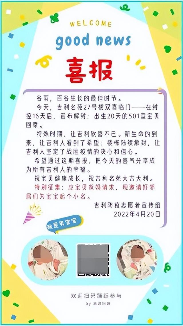 按捺不住内心的喜悦,轩妈第一时间把楼栋解封、宝宝回家的双喜讯分享到27号楼居民群里后,喜讯不胫而走。吉利名苑防疫志愿者团宣传组连夜制作,于当晚10:49在小区群发布喜报,并应宝宝父母请求,通过喜报请小区居民为宝宝起小名。虽已近深夜,但这个吉利名苑封控后迎来的第一个新生命,让小区居民欣喜不已,大家在群里第一时间点赞、嘱咐,踊跃为宝宝起名。