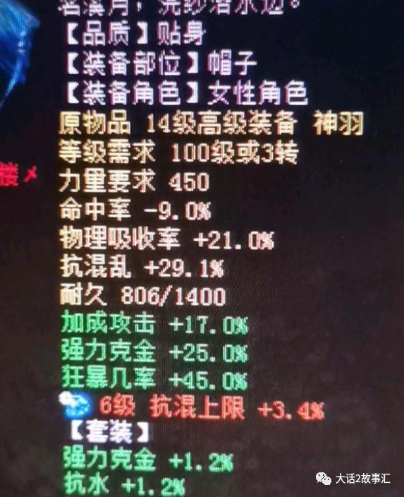 第三位玩家供稿的几率牛图,则稍微有点可惜,我们先来看看这件装备的属性。底子是物理吸收率加21,抗混乱加29.1,炼化效果加成攻击加17,强力克金加25,狂暴几率加45,套装绿字强力克金1.2还是有继续进步的空间。毫无意外这是一件非常极品的大力帽子,美中不足的就是强克属性是金而不是水五行或者火五行。不然价格可以飞天。