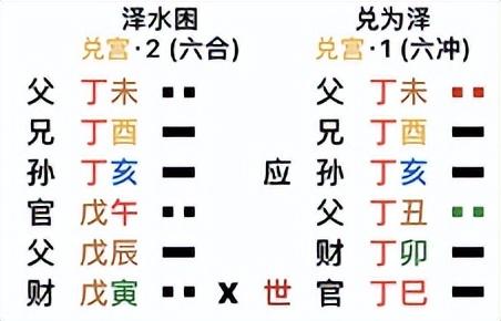 困卦,上兑下坎,兑秋,坎冬,所以有自秋而冬之象,阴气日盛,阳气日消。贲卦上艮象阻,下离象明,无明所谓困顿之时。艮象止,震象行,互坎象智,下离象明。君子外暗而内慧之象。变卦困,上兑象泽,下坎象众,泽水掩众之象,巽象高,离象正,生正志坚,重险在外,唯君子能济困救难,涉险过关,所以说贞大人吉,无咎。互巽象有,上兑象言,互离象正,下坎象非,为众。虽然居正行言礼,但是众人均以为非。巽有败言之象,败言为责。贲卦上艮为不,下离象信,所以说有言不信。