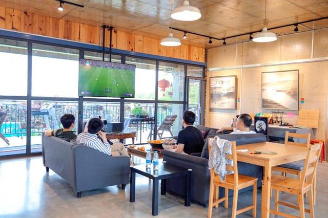 三层楼前,摆放了几张桌凳,我们可以坐在这里喝咖啡聊天,或者坐在一楼大厅,透过这大大的透明落地玻璃,观赏日出日落,欣慰的守护着草地上的亲人朋友,老宅变身成绿意盎然的小庭院,我们则从紧张忙碌的工作、生活中抽离出来,千里迢迢来民宿遇见有趣的人,一起发呆、冥想、思考人生,宁静、自然,享受当下。